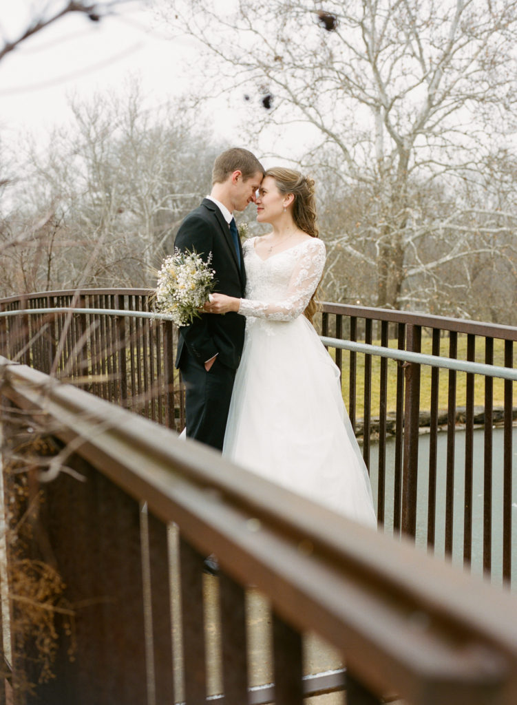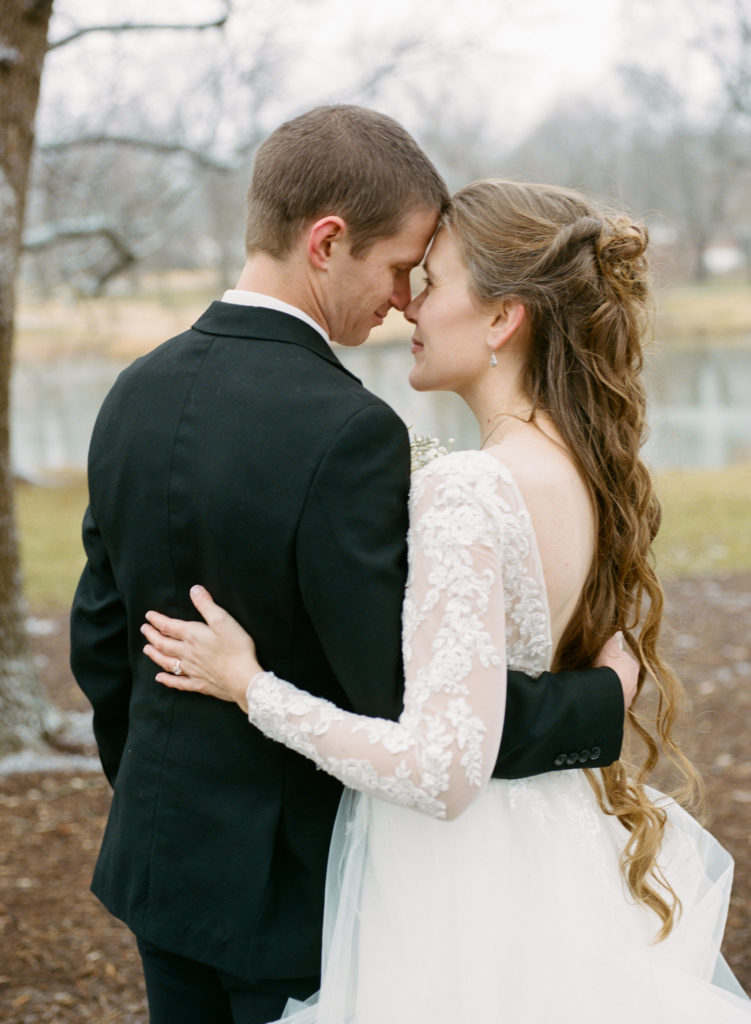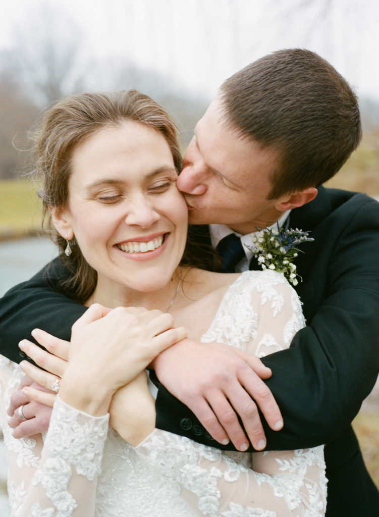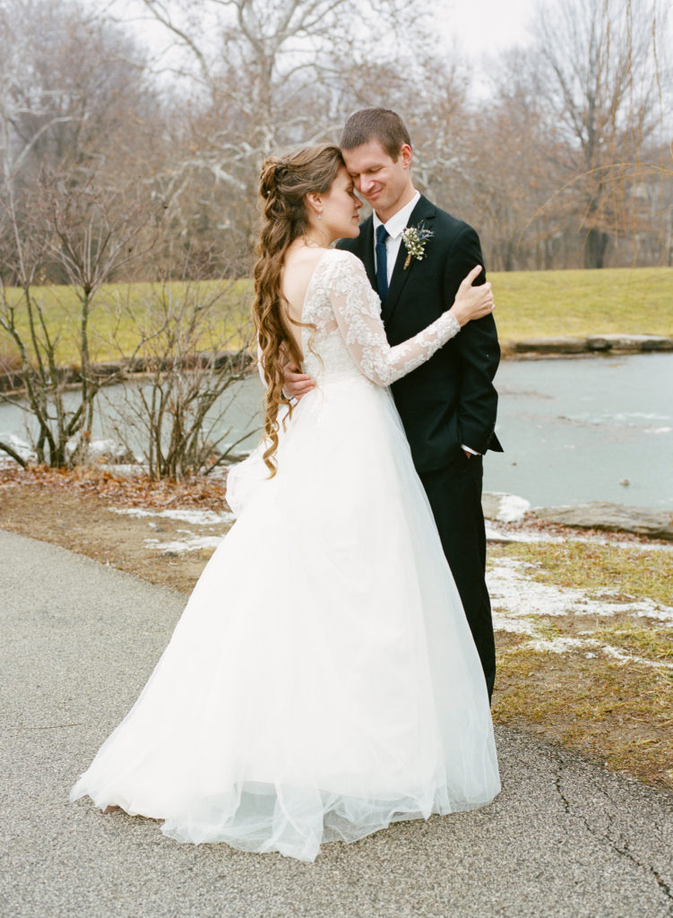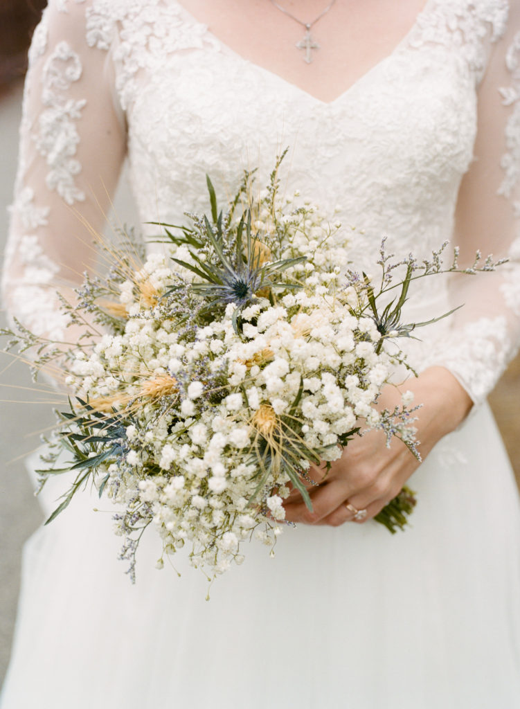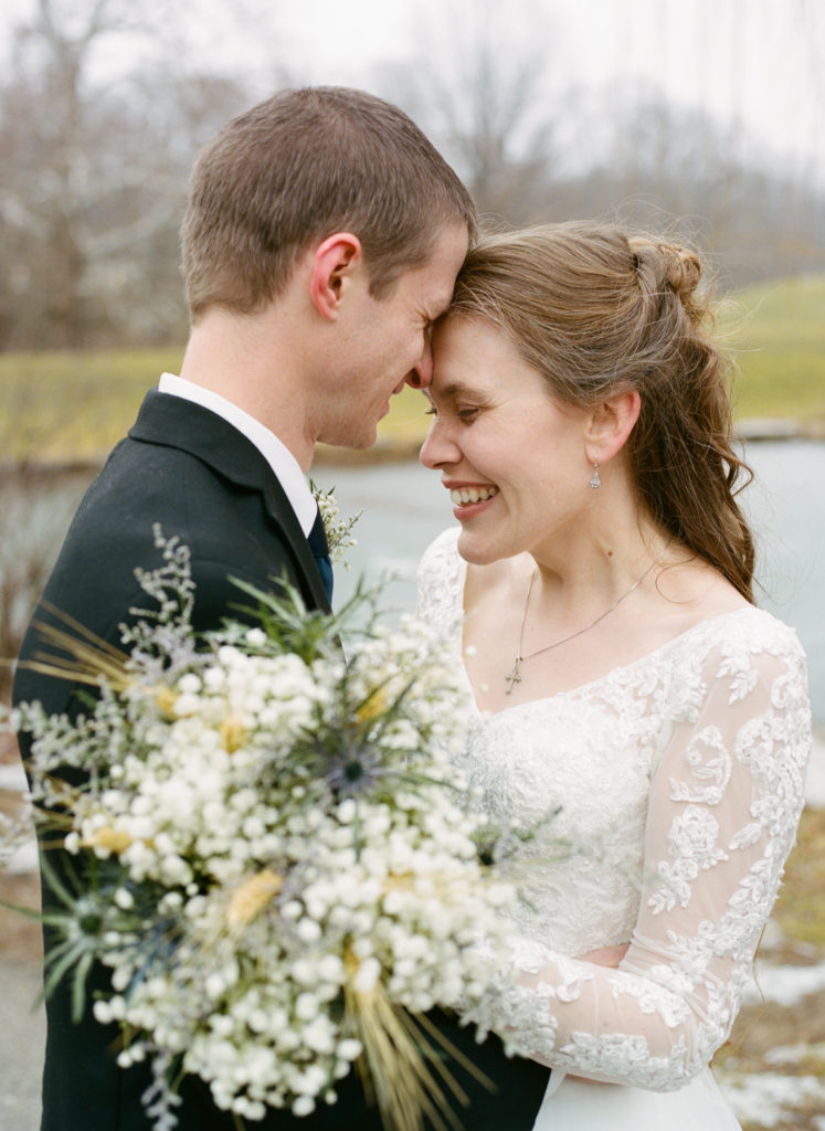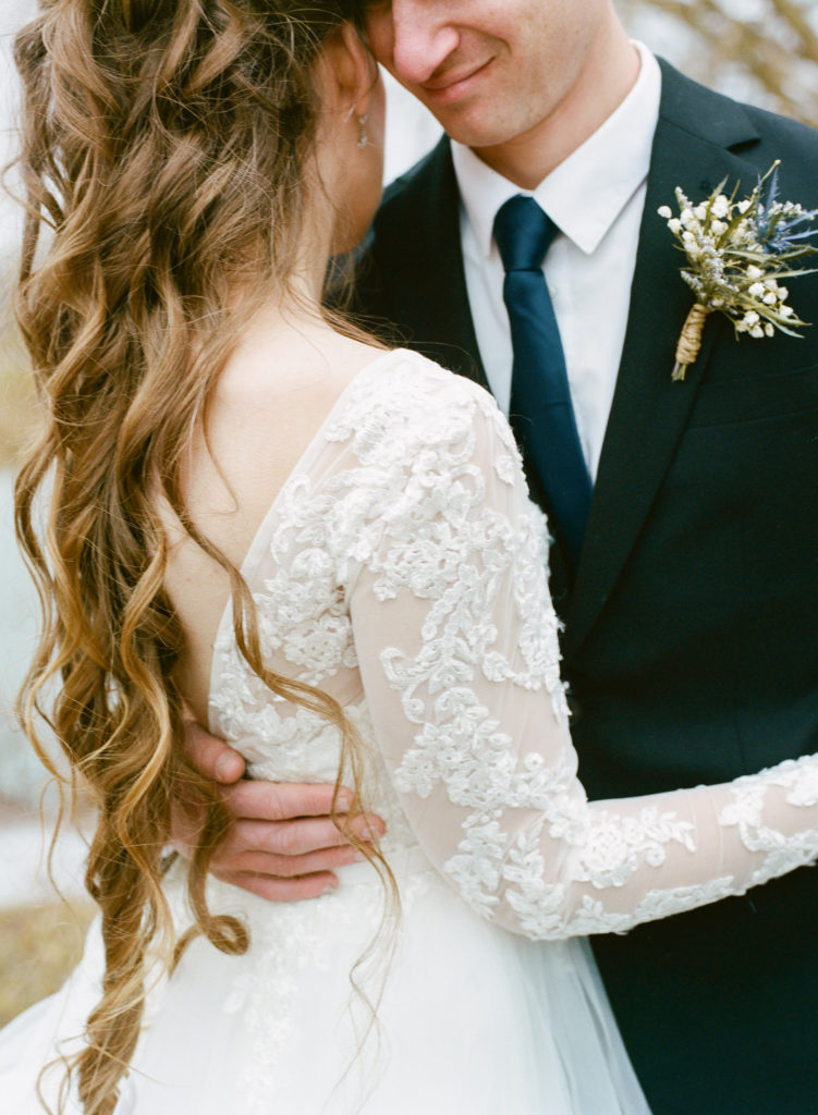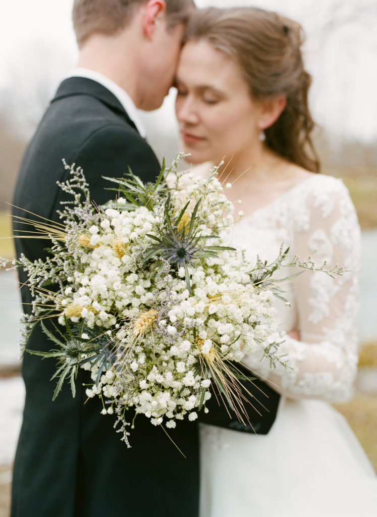 The first time I spoke with Kelly, she mentioned our mutual love of classic writers such as Jane Austen and the Bronte sisters. So it was perfectly fitting that her and David’s wedding happened to be on a misty winter day reminiscent of a classic novel setting on the foggy English moorside. Together with her textured thistle and baby’s breath bouquet and long-sleeved lace wedding gown, Kelly’s vintage romance wedding day was complete.