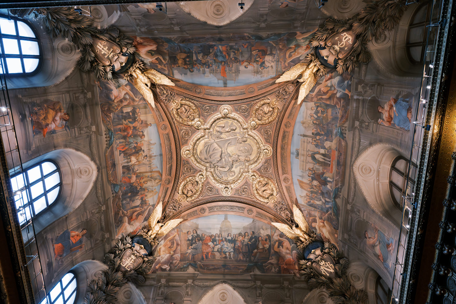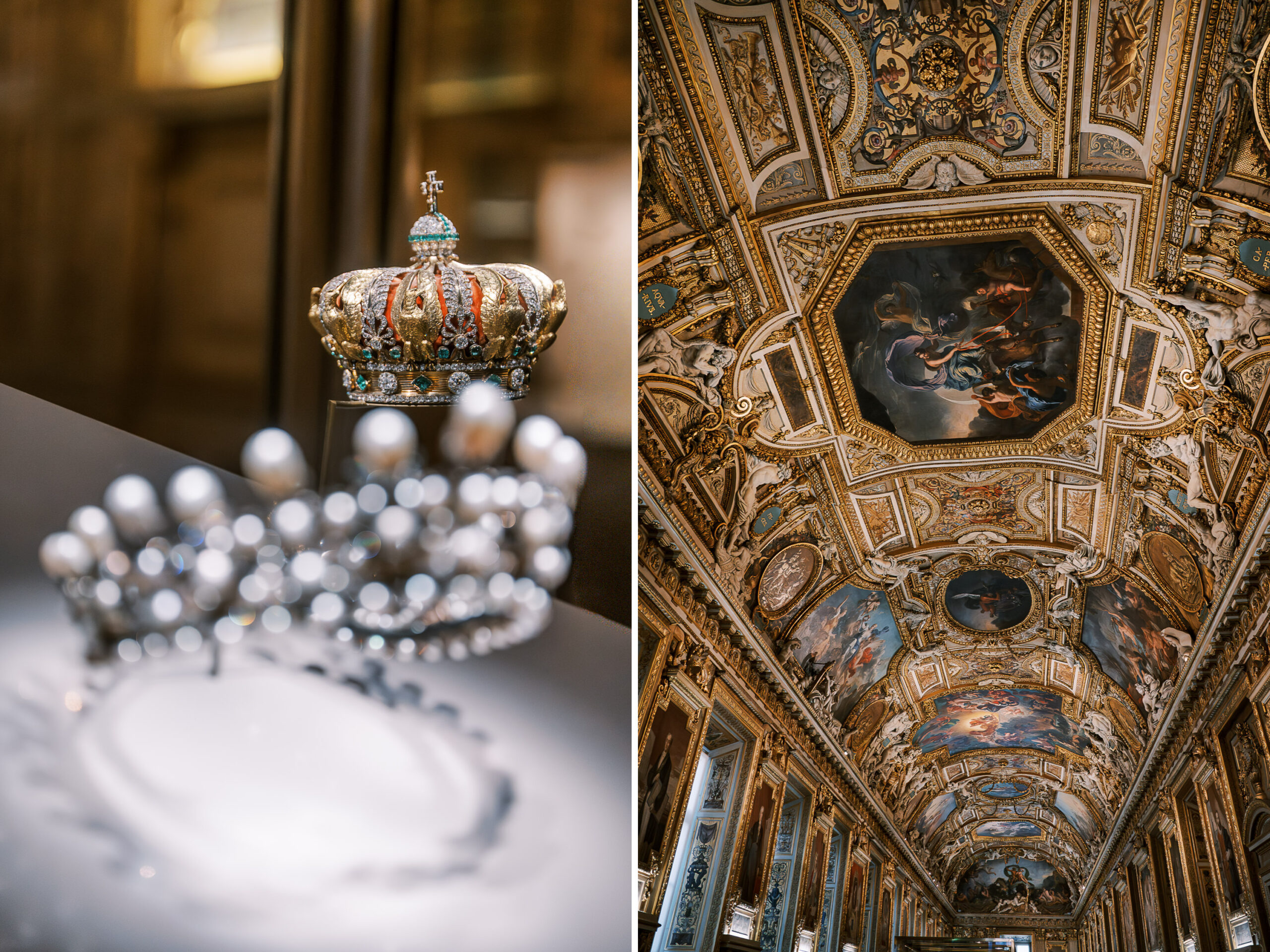 Empress Eugenie’s jewels stolen on 10-19-25: the Crown (background in focus) was recovered damaged and the diadem of pearls (foreground, out of focus) is still missing; Louvre, Galerie d’Apollon